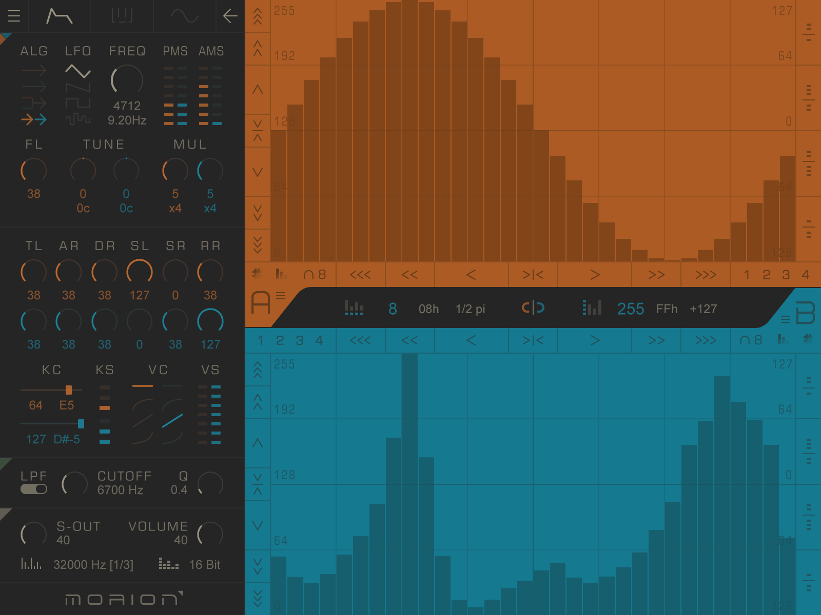MORION Wは波形メモリ音源と呼ばれる、1周期の波形を極めて少ないサンプル数で記憶して出力する波形テーブルを持つ音源をモチーフに開発しました。このシンセサイザーでは可変サイズの波形テーブルを2基搭載。これらの出力で周波数変調(FM)して音声合成することができます。